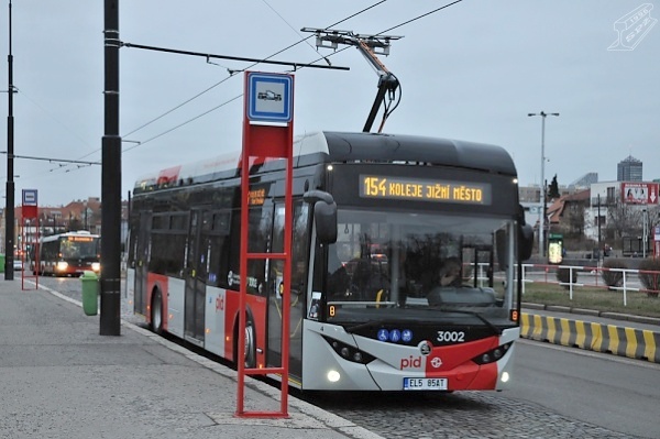 Na snímku z 26. ledna 2022 je zachycen elektrobus Škoda E’CITY evidenční číslo 3002 při dobíjení na zastávce Strašnická před odjezdem linky 154 na další obrat.