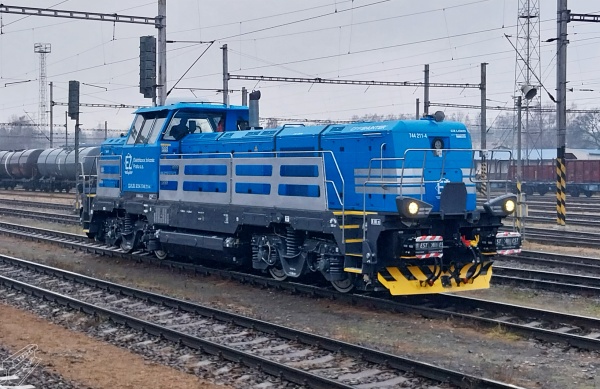 Na snímku z 5. 12. 2025 je zachycena po dojezdu do Havlíčkova Brodu lokomotiva 744.211, která se tohoto podmračeného deštivého dne vydala na svoji první zkušební jízdu z Jihlavy.