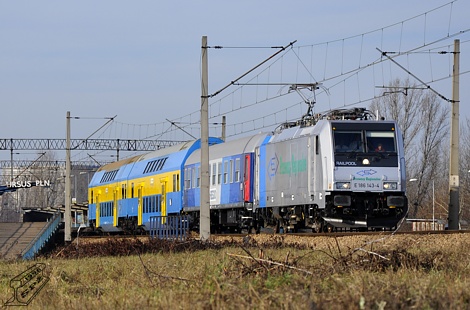 Snímek z 27. listopadu 2009 zachycuje lokomotivu E 186.143-4 u zastávky Warszawa Ursus Północny v čele vlaku IR 51132 „Brda“ Bydgoszcz Główna - Warszawa Wschodnia.
