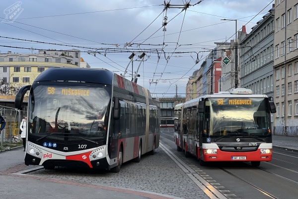 Další fáze zkušebního provozu trolejbusů SOR TNS 18 DPP), tak náběh nové linky není bezproblémový. Nové trolejbusy SOR TNS 18 stále vykazují technické problémy a jsou od prvního dne provozu linky č. 58 doplňovány i naftovými trolejbusy SOR NB 18 DPP. To dokumentuje i snímek z 9. února 2024, kdy se na Palmovce na lince č. 58 potkal trolejbus SOR TNS 18 ev. č. 107 s autobusem SOR NB 18 ev. č. 6785.